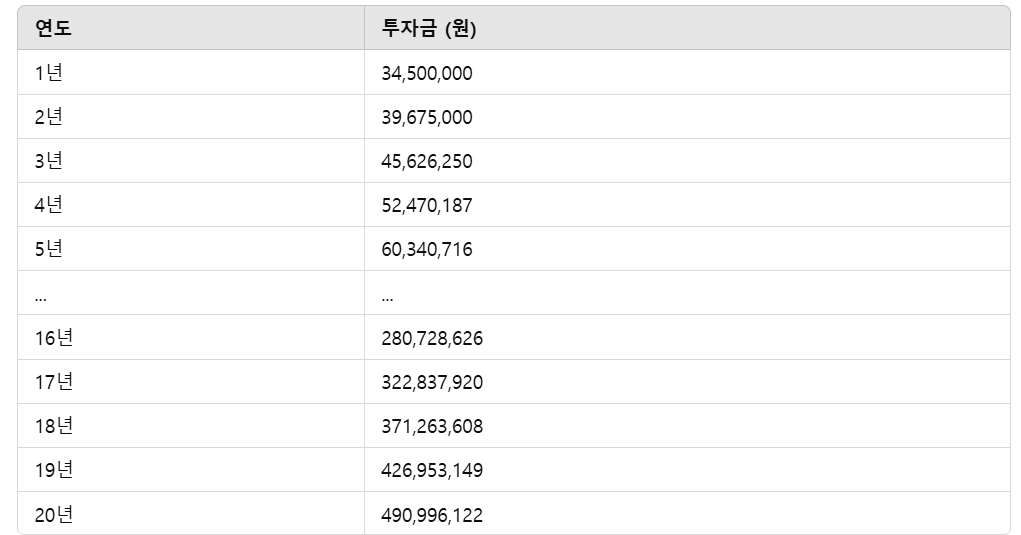 20년 후  3,000만 원은 약 4억 9천만 원(약 16.4배)으로 증가합니다.
