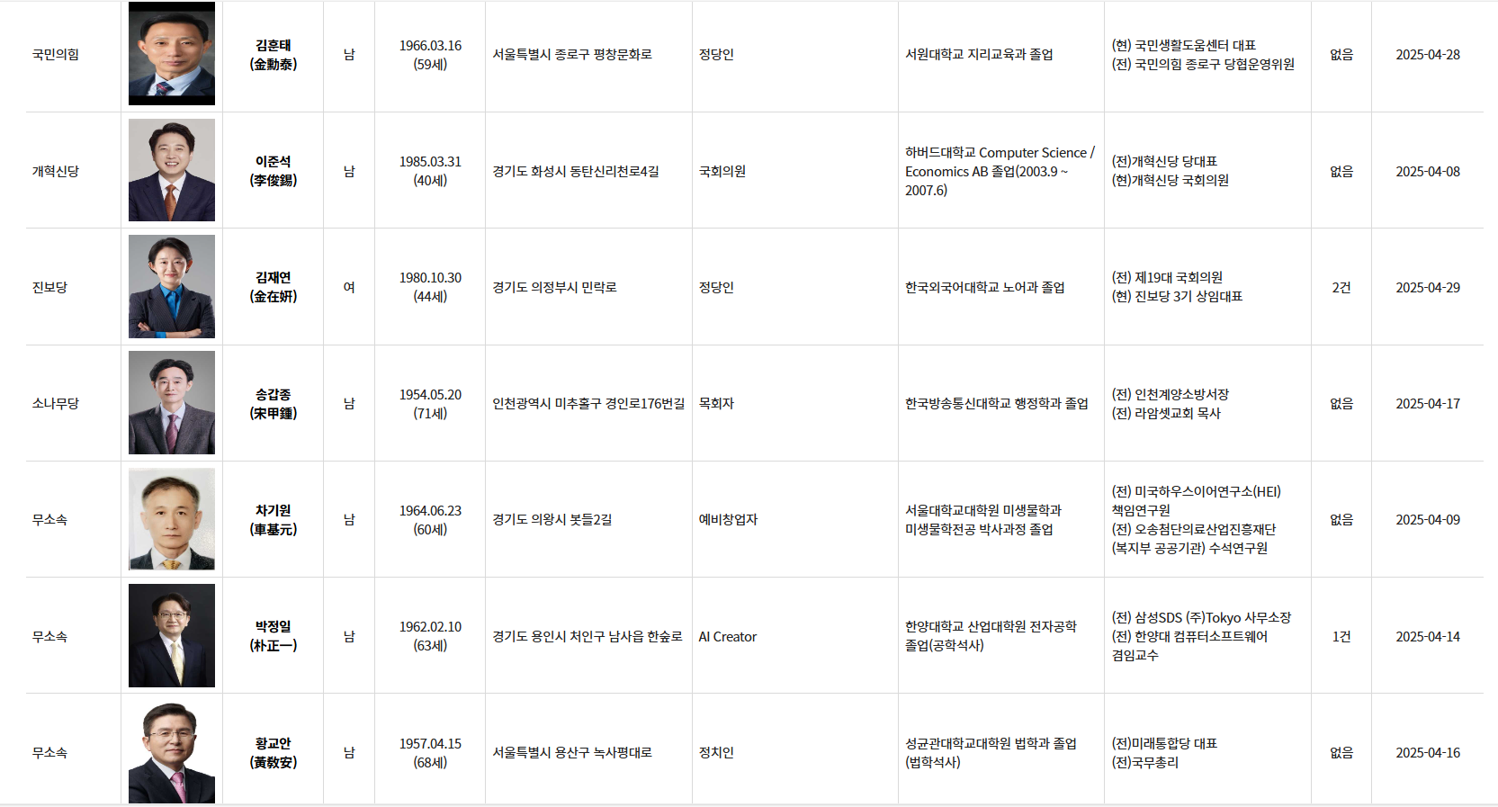 🗳️ 대통령 재보궐선거 예비후보자 명부